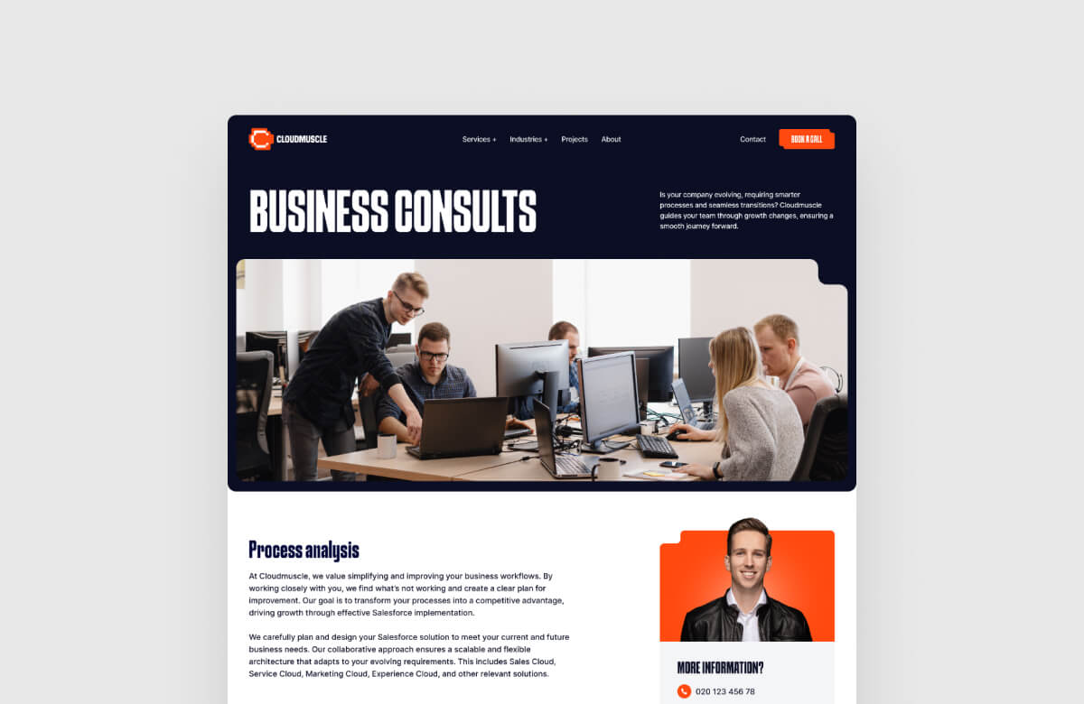 De vernieuwde website van Cloudmuscle heeft hun online aanwezigheid aanzienlijk versterkt, waardoor hun merkautoriteit en klantbetrokkenheid zijn toegenomen. Dankzij de moderne, gebruiksvriendelijke interface kunnen bezoekers eenvoudig navigeren en snel toegang krijgen tot de relevante informatie over Salesforce-integratie en -adviesdiensten. Dit verhoogt niet alleen de efficiëntie voor potentiële klanten, maar onderstreept ook Cloudmuscle’s expertise in hun vakgebied. De responsieve opzet zorgt daarnaast voor een consistente ervaring op alle apparaten, wat het vertrouwen vergroot en de merkbeleving verder verdiept, waardoor Cloudmuscle zich onderscheidt als een toonaangevende partner in hun sector.